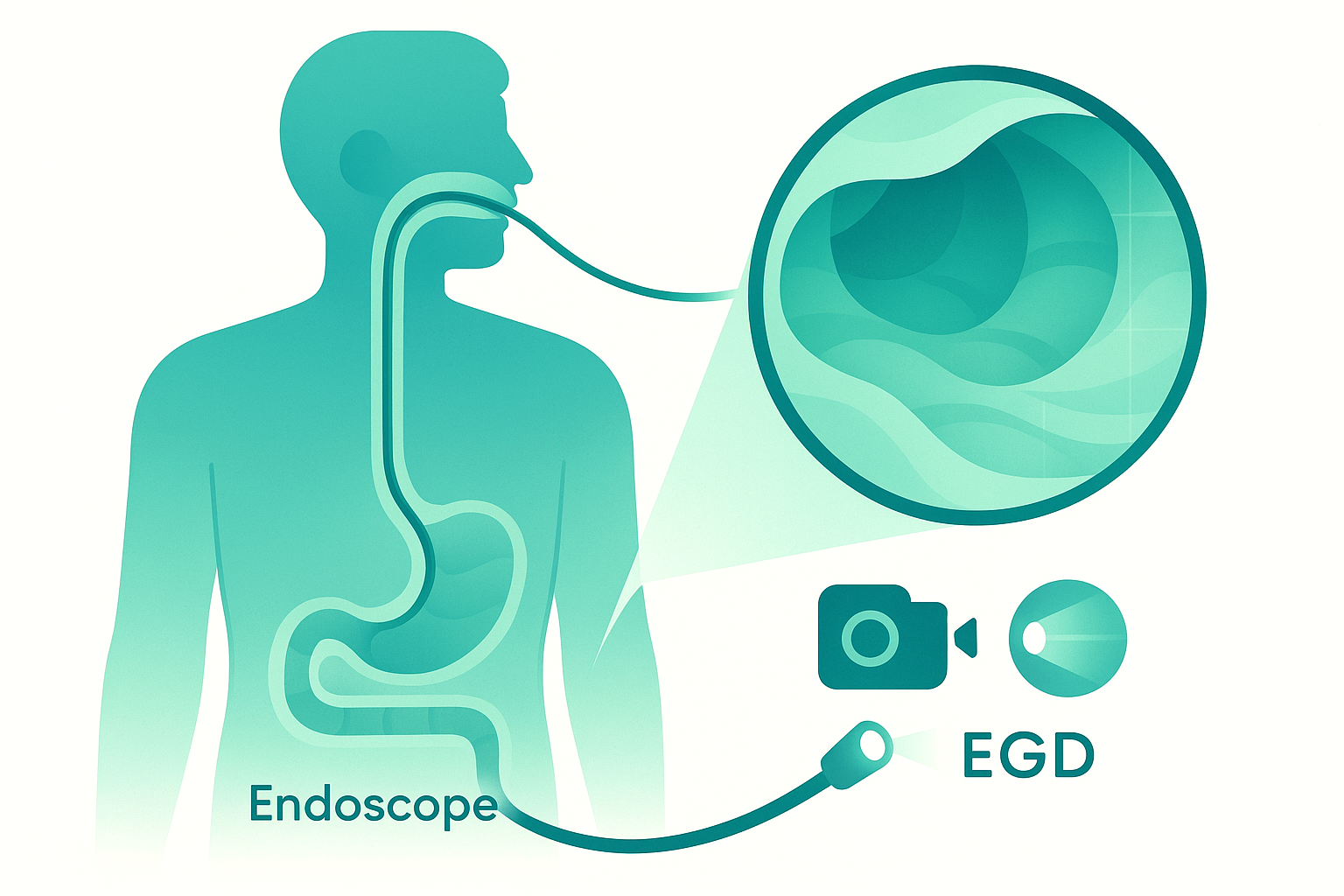 An EGD (esophagogastroduodenoscopy) goes from your mouth down your esophagus, through your stomach, into the first part of your small intestine. Think of it as checking the entry corridor and lobby of the gut.